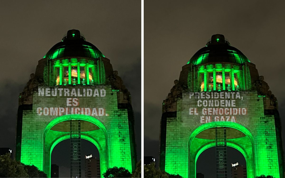 Un grupo de activistas llevó a cabo una manifestación visual la noche del domingo 21 de septiembre en el Monumento a la Revolución para exigir a la presidenta Claudia Sheinbaum condenar el “genocidio” en Gaza perpetrado por Israel. Con frases como “Presidenta, condene el genocidio en Gaza” y “Neutralidad es complicidad”, los manifestantes reclamaron una