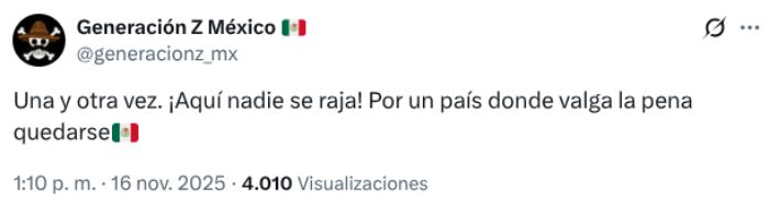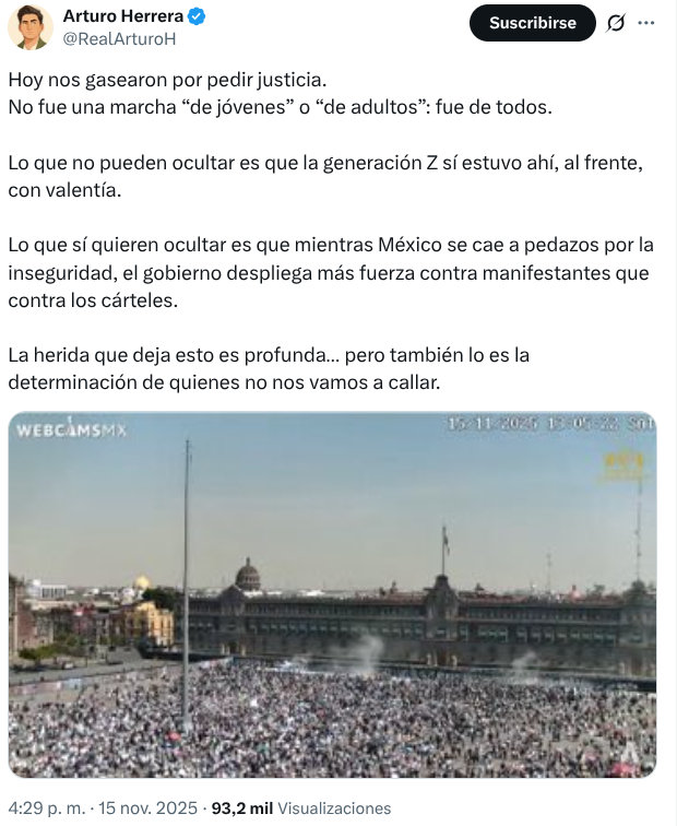 “Hoy nos gasearon por pedir justicia. La generación Z sí estuvo ahí, con valentía. Cuando México se cae a pedazos, el gobierno despliega más fuerza contra manifestantes que contra cárteles.”