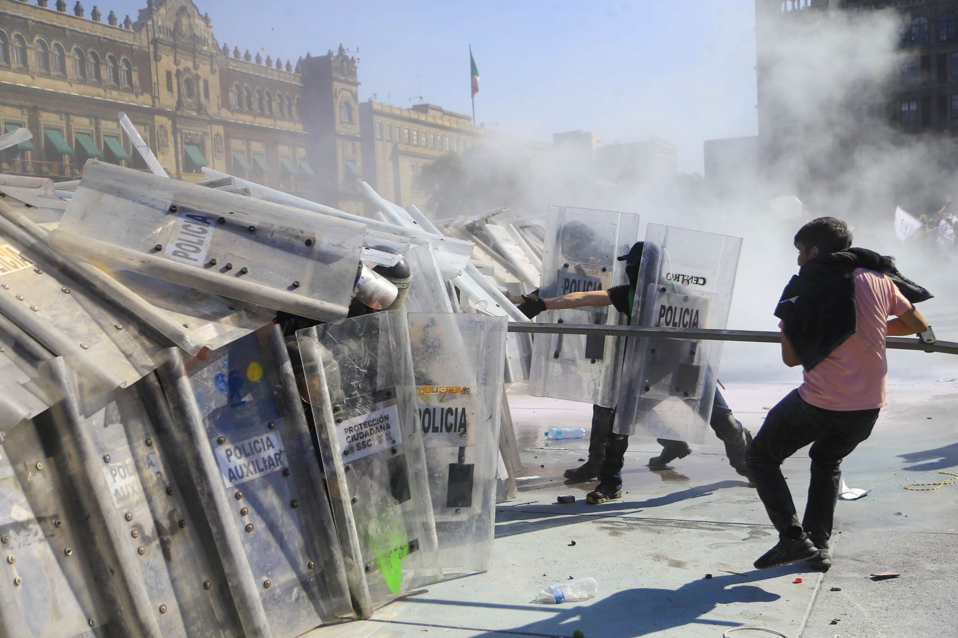 El recorrido inició en el Ángel de la Independencia de forma pacífica y terminó en la plaza más grande del país, donde el “bloque negro” de la marcha golpeó con martillos y piedras las vallas que resguardaban el Palacio Nacional hasta derribarlas.