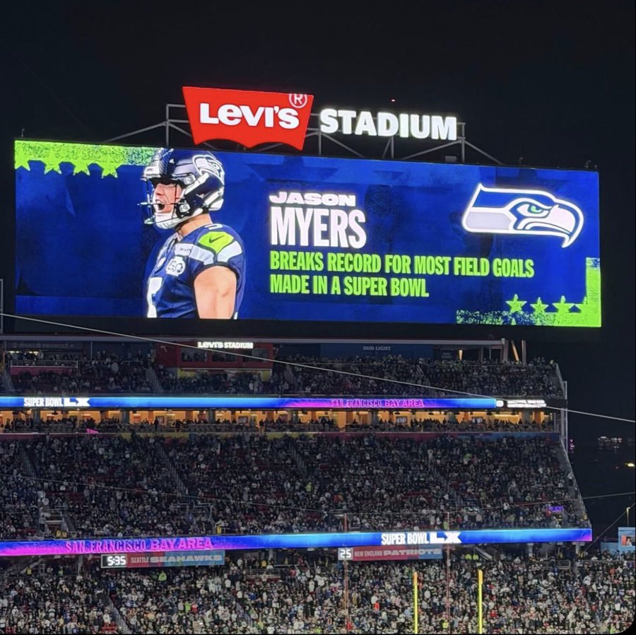 En la victoria de los Seahawks 29-13 sobre los New England Patriots en el Super Bowl LX, Myers impuso un récord al convertir cinco goles de campo en este tipo de partidos.