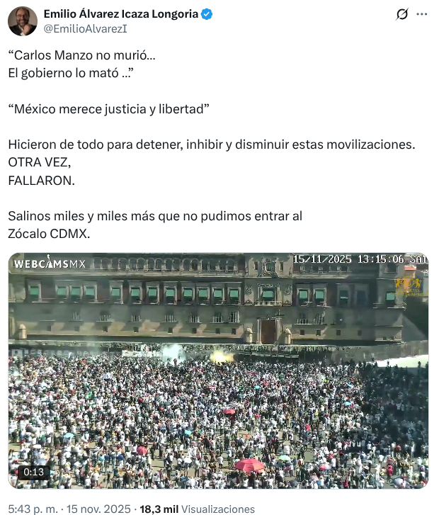 “Carlos Manzo no murió…El gobierno lo mató …”, denunció en su cuenta de X (antes Twitter). En su publicación también sostuvo: “Hicieron de todo para detener, inhibir y disminuir estas movilizaciones. OTRA VEZ, FALLARON. Salimos miles y miles más que no pudimos entrar al Zócalo CDMX”.