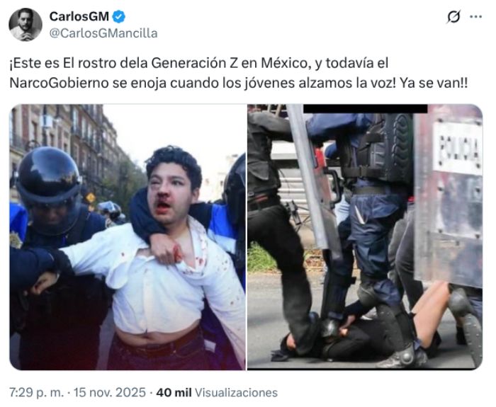 “Cuando la plaza se convirtió en trinchera, llegó la orden de ‘limpiar’ el Zócalo. Jóvenes y familias tosiendo por gas lacrimógeno, golpeados por policías. En este país solo hay abrazos para los delincuentes, y represión para los jóvenes.”