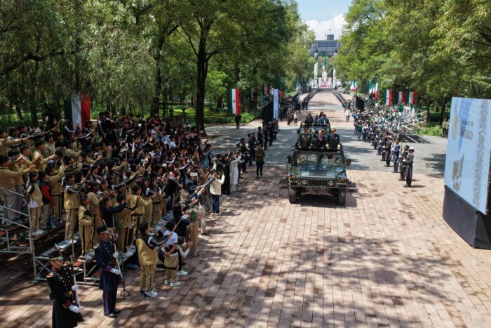 La presidenta mexicana pasó revista a cada uno de ellos, entregó espadines a nuevos cadetes y escuchó la salva de fusilería que los integrantes del Heroico Colegio Militar realizaron en honor de los jóvenes héroes.