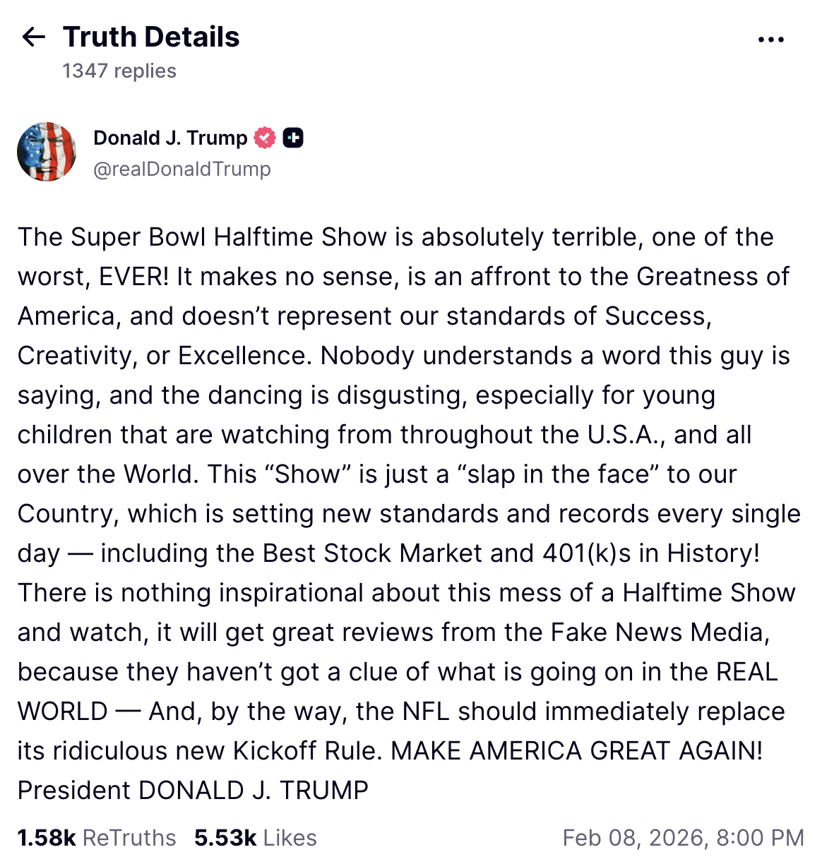 De hecho, el mandatario republicano consideró la presentación de Bad Bunny como “absolutamente terrible” así como uno de los peores espectáculos de medio de tiempo de un Super Bowl de la historia.