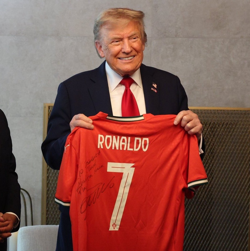 🚨🇵🇹🇺🇸 | BASADO: Cristiano Ronaldo afirmó que “Donald Trump es uno de los hombres que pueden cambiar el mundo”, y le regaló una camiseta al presidente de EEUU con la frase “playing for peace”. pic.twitter.com/2Sdy0Od2uR